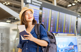 Young Asian woman passenger with carry on luggage is looking at her boarding pass after self check kiosk in at airport terminal for international travel flight and vacation