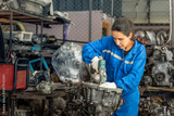 auto professional mechanical technician garage motor car engine woman check automobile engine for diagnostic maintain transmission machine. technician worker auto in garage check engine car motor