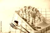 A rectangular cake with banana slices on top and drizzled with caramel sauce.