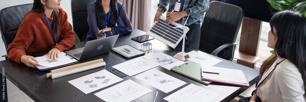 Solar panels green energy Business people working in green eco friendly office business meeting creative ideas for business eco friendly professional teaching corporate people sustainable electricity