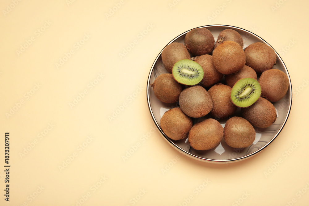 Green kiwi on beige background. Tropical fruit.