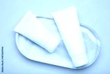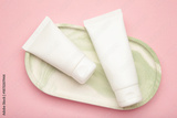 White plastic cosmetic tubes on plate on pink background. Space for text