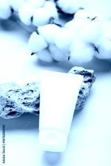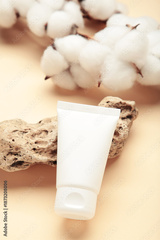 White cream tube on stone with cotton flower on beige background. Skincare handmade beauty product. Vertical photo