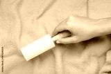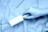Woman cleaning blue clothes background texture. Sticky roller, pet cat dog fur dust hair remover
