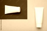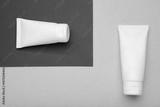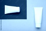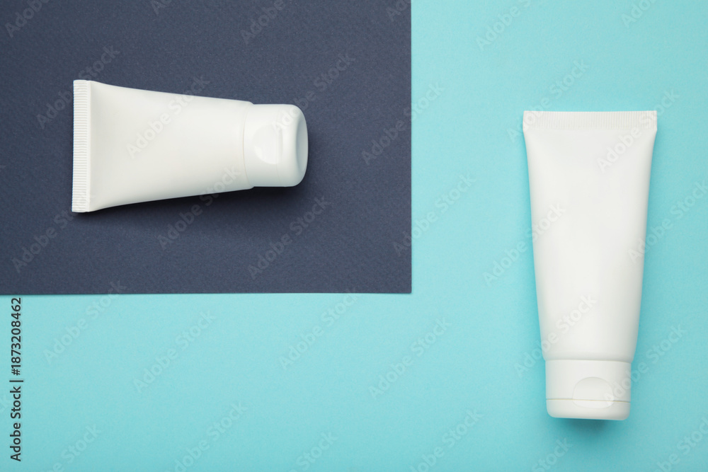 White plastic cosmetic tubes on blue background. Space for text