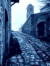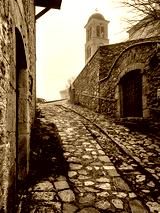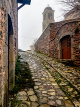 Traditional village of Dimitsana, in Arcadia, Peloponnese, Greece on a beautiful foggy winter day