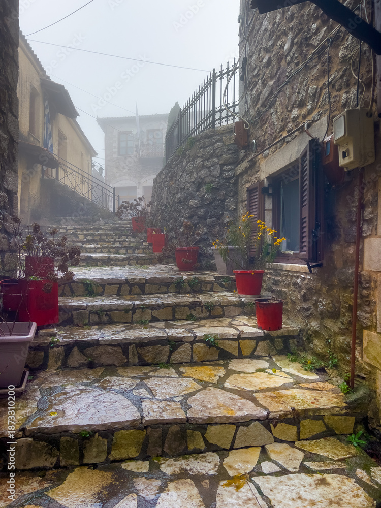 Traditional village of Dimitsana, in Arcadia, Peloponnese, Greece on a beautiful foggy winter day