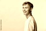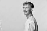 Smiling man in casual clothing stands against a light studio background, conveying happiness, relaxed mood and modern style for lifestyle, fashion and commercial use