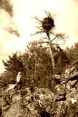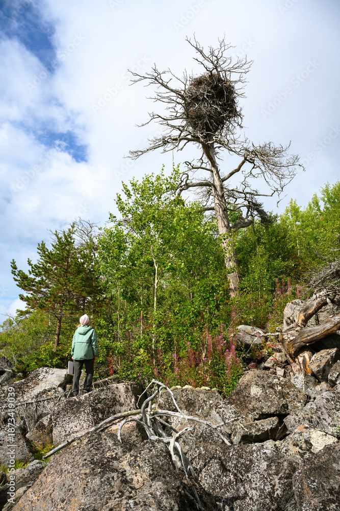 Nest of eagle on dry tree and adventurer at rocky shore of White Sea, Karelia, Russia, nature of North