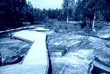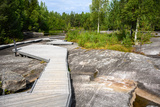 Walkway at area of prehistoric petroglyphs with stone and water in Zalavruga, Karelia, Russia