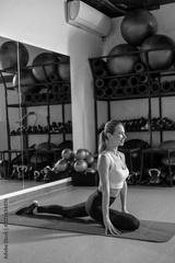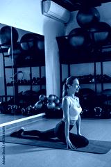 Blonde young woman doing yoga in the gym and looking concentrated