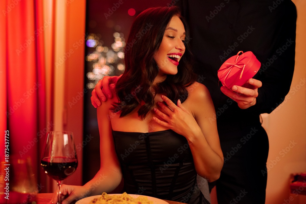 Surprised woman smiling joyfully looking at gift box held by man, couple having intimate dinner with wine and pasta in romantic atmosphere