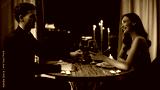 Happy spouses clinking glasses drinking wine celebrating Valentine's day during romantic dinner in restaurant, panorama. Romance in relationship