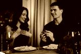 Will you marry me. Man holding open box, offering marriage ring to his girlfriend, getting engaged in restaurant during romantic date