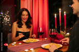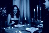 Romantic date, woman smiling while eating pasta, couple celebrating Valentine's day in cozy setting with candles