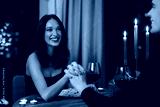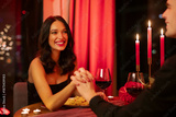 Couple enjoying dinner with pasta and red wine, candles create warm light and intimate atmosphere, man and woman holding hands during conversation