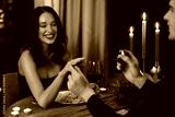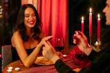 Valentine's Day proposal. Happy man putting ring on his girlfriend hand, she said yes during romantic date in restaurant