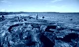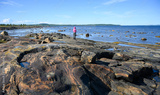 Landscape with solitary figure on rocky beach and calm blue White Sea in Karelia, Russia, concept of northern nature