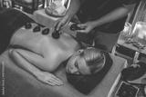 Hot stone massage at spa salon in luxury resort with warm candle light, blissful woman customer enjoying spa basalt stone massage glide over body with soothing warmth. Quiescent