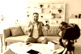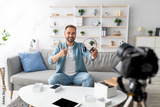 Cheery male vlogger recording video review of wireless headphones at home. Positive young blogger showing electronic device at camera, giving feedback, promoting new model of gadget