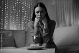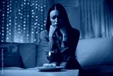 Crying sad woman looking at birthday dessert with lit candle, lady with unhappy expression being upset to celebrate alone