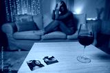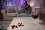 Focus on parts of torn photo and glass of wine with young woman crying after breakup with ex boyfriend sitting on sofa on background. Breakup or divorce concept