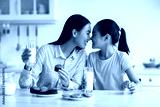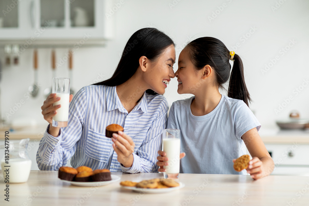 Loving asian mother and little daughter having snacks and drinking milk in kitchen interior, enjoying freshly baked cakes. Happy family eating homemade pastry and bonding at home