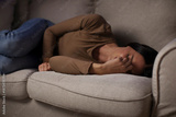 Stressed young woman lying on sofa feeling desperate, worrying about personal problems, loneliness, depressive mood concept