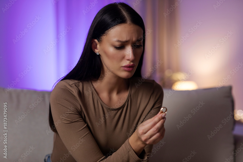 Unhappy thoughtful woman looking at marriage ring, sitting alone in living room interior. Quarrel and breakup, divorce and human emotions, relationship problems