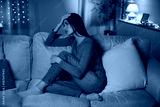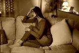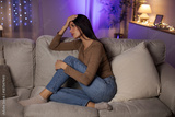 Pensive depressed lady sitting on couch, leaning head on hand and looking away, suffering mental breakdown or painful breakup