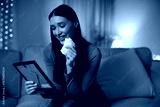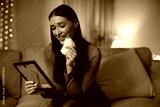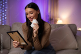 Emotional lady sitting on sofa, holding framed photo and wiping tears, expressing sadness with smile, suffering painful breakup
