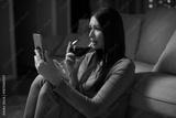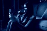 Young depressed woman drinking wine and crying while looking at smartphone screen, sitting at home in dark room, evening scene