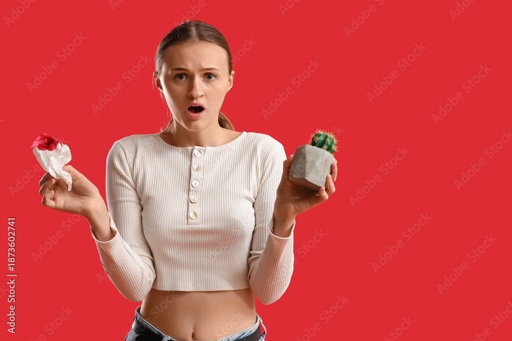 Shocked young woman with cactus and bloody paper on red background. Hemorrhoids concept