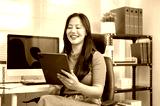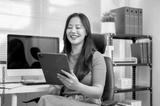 Asian woman freelancer office worker holding looking at tablet sitting on leather chair in company.