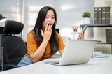Asian woman freelancer or office worker holding phone looking at laptop as sitting at company table.