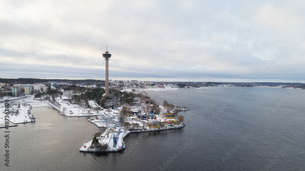 Aerial view of the Tampere city at winter. View from nasijarvi lake.
