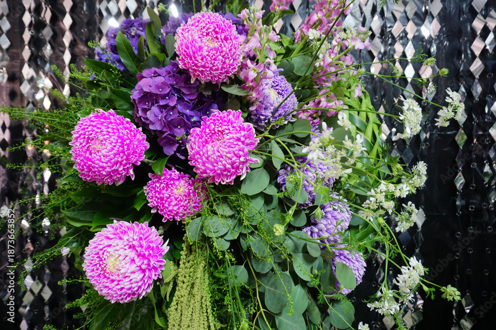 Colorful flowers decoration background. Beautiful flower arrangement creation. Floral backgrounds in shade of pink and purple colors.