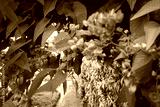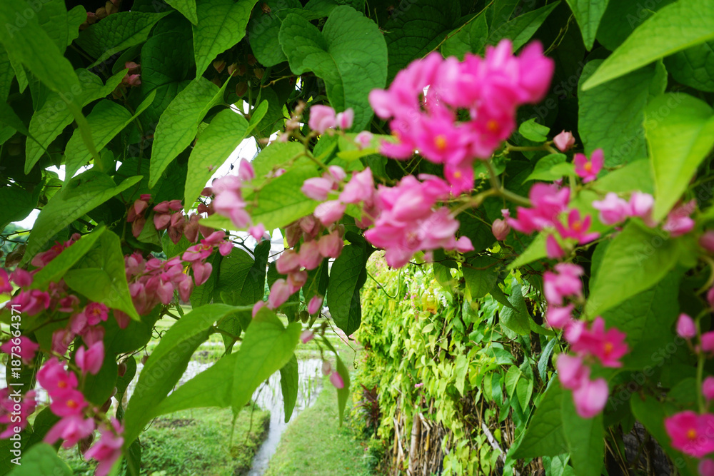 Pink coral vine flowers or Chain of Love flower plant growing in the garden with green leaves frame background. Fresh green nature backgrounds. Natural floral background.