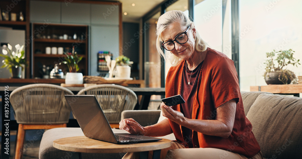 Credit card, laptop and senior woman on sofa in home with online shopping, ecommerce or payment. Happy, debit and elderly female person with computer for internet banking for purchase in living room.