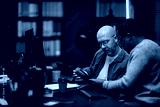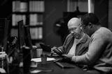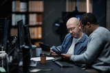 Middle aged Caucasian man and young adult Black man working together at desk using digital tablets and computer monitors, focusing on documents and collaborating in modern office
