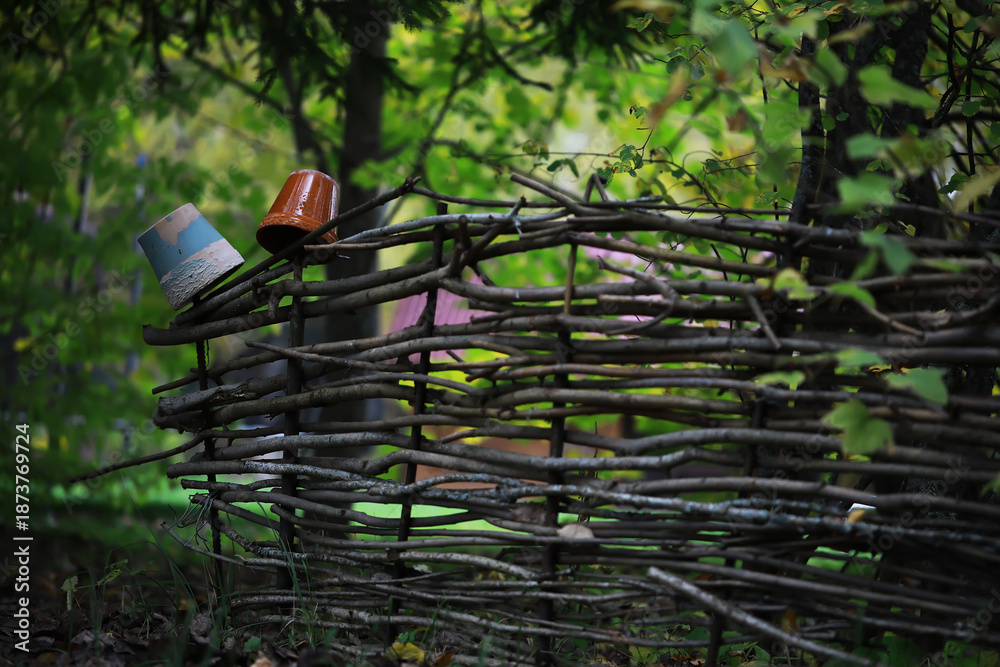Rustic Garden with Woven Fence and Hanging Pots in Lush Greenery
