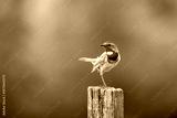Beautiful small songbird with bright blue throat stands in expressive pose, tail cocked up. Male of Bluethroat bird or Luscinia svecica perched on wooden post on green blurred background. Copy space