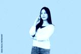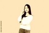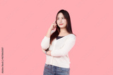 Asian woman, Thai cute model teen girl standing isolated with Thinking guess thoughtful expression