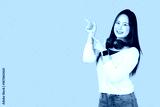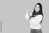 Portrait Asian teenage woman standing happy smile studio shot isolated, hand pointing.