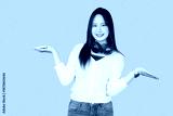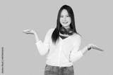 young teen girl happy smile enjoy music from phone, listening music by headphone studio isolated