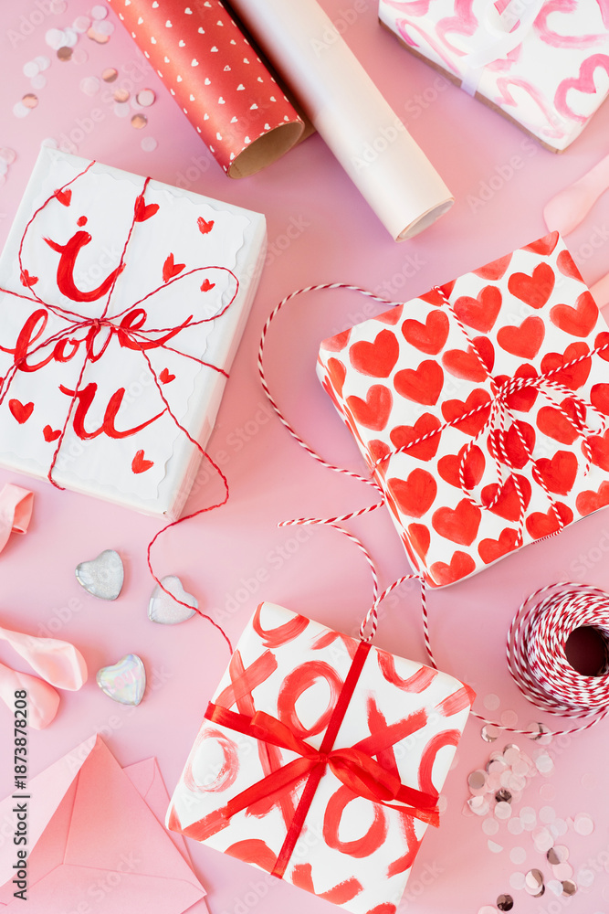Valentine gift wrapping flat lay with heart patterned boxes and pink copy space
