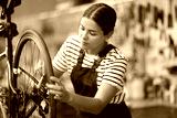 Young woman bicycle repair service worker in uniform oiling bicycle wheel