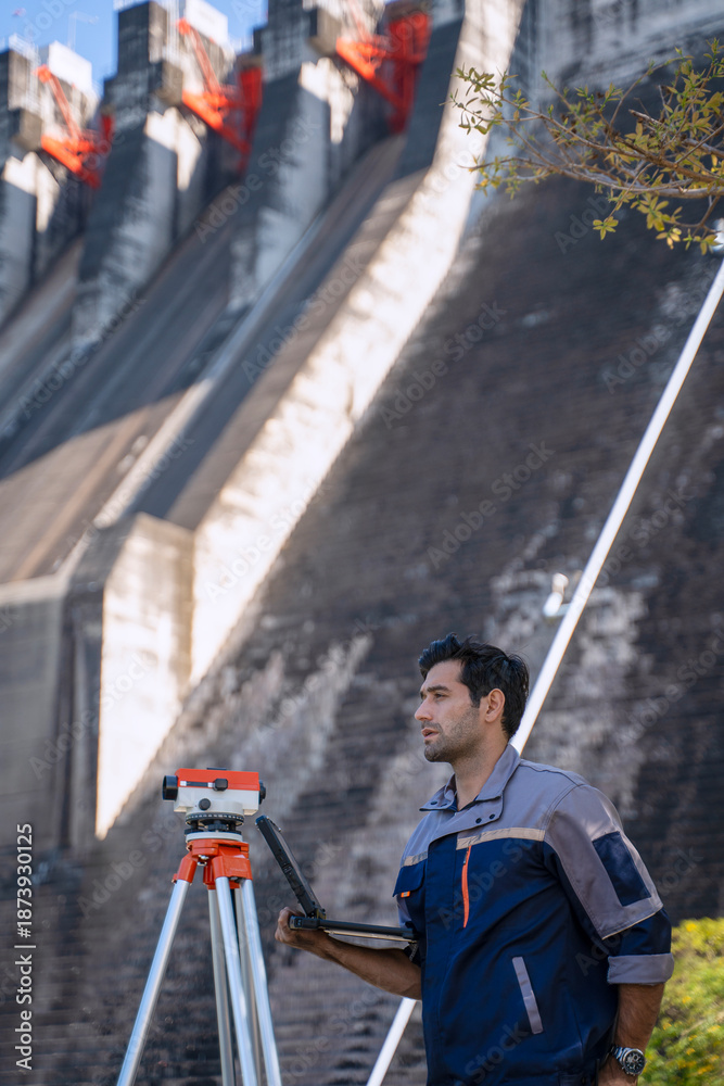 Blue collar worker is working at the dam.
