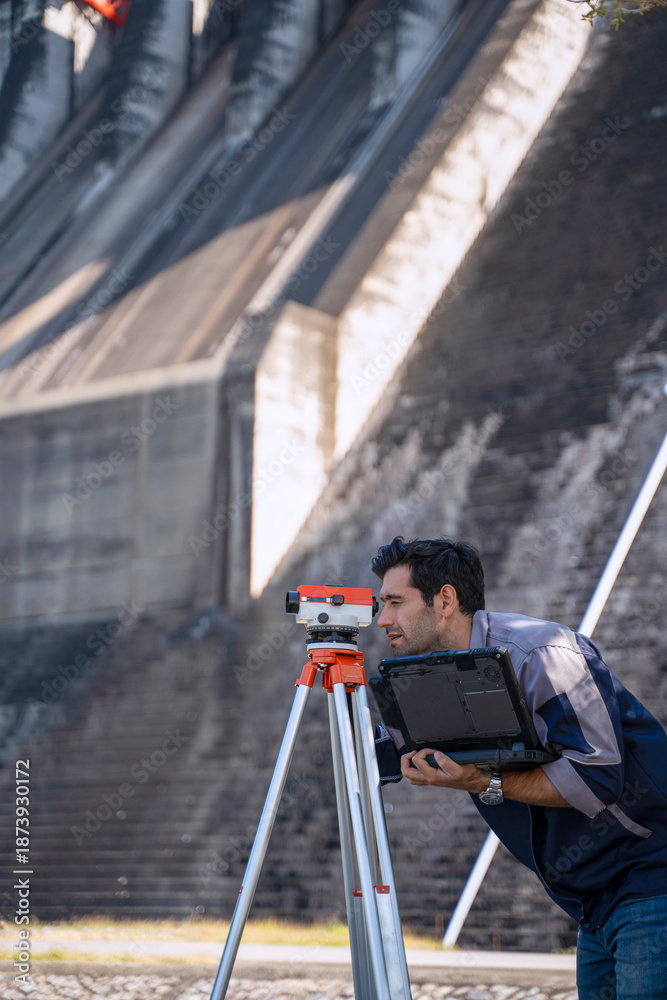 Blue collar worker is working at the dam.