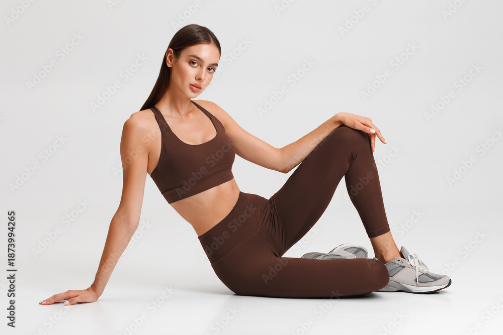 Athletic girl on the gray background. Fitness woman